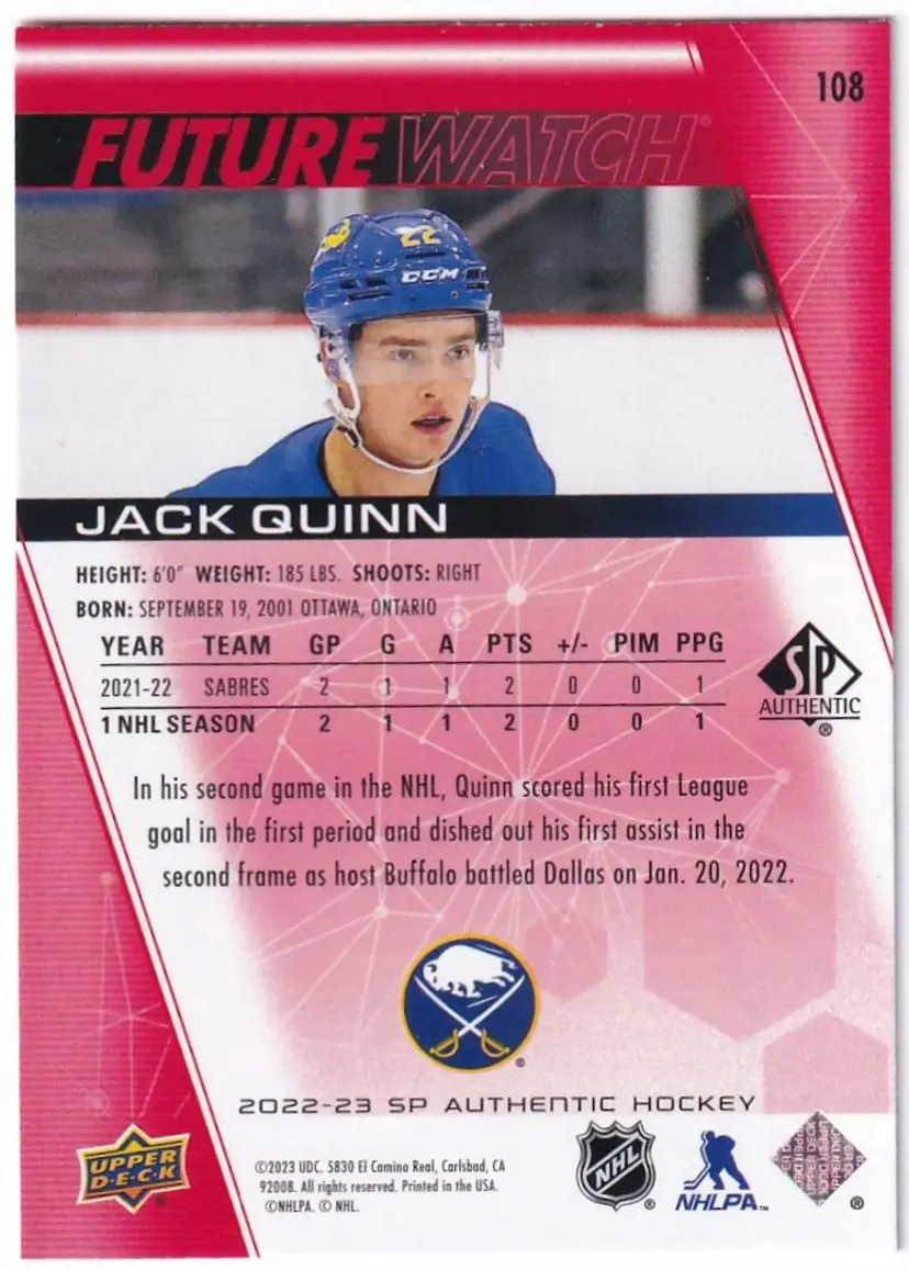 2022-23 SP Authentic Limited Red #108 Jack Quinn FW Buffalo Sabres