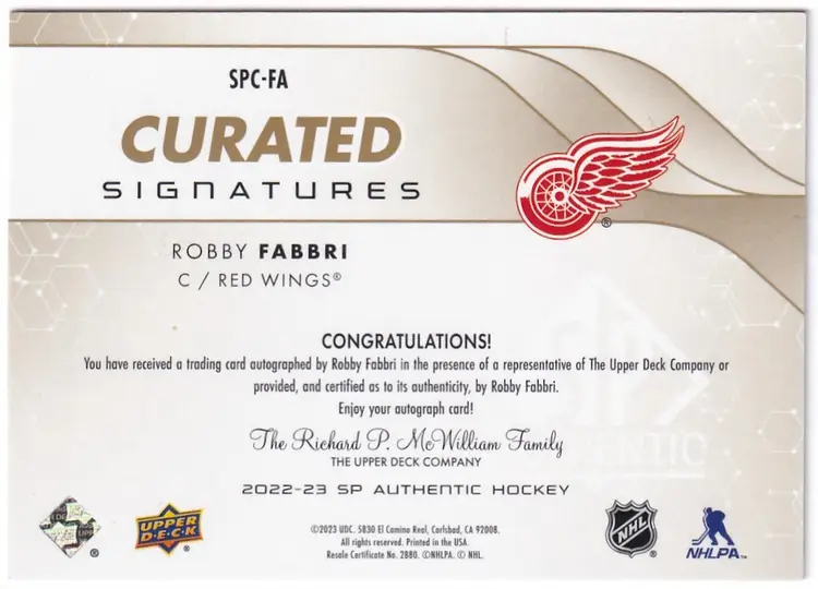2022-23 SP Authentic SP Curated Signatures #SPCFA Robby Fabbri Detroit Red Wings Print Run - 199