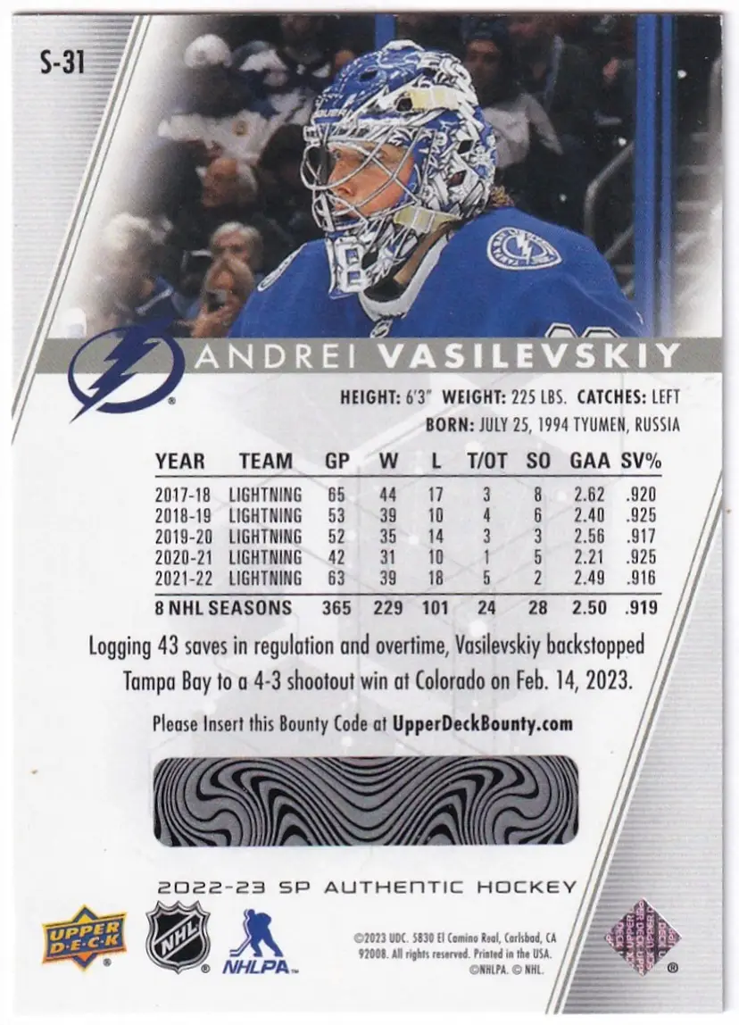 2022-23 SP Authentic Spectrum FX #S31 Andrei Vasilevskiy Tampa Bay Lightning
