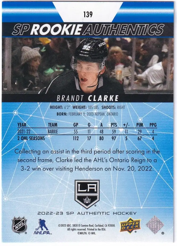 2022-23 SP Blue #139 Brandt Clarke Los Angeles Kings