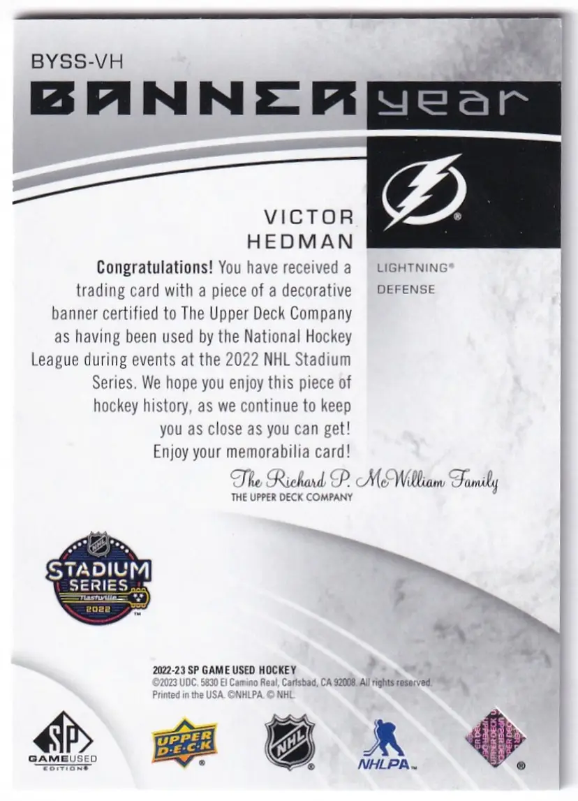 2022-23 SP Game Used '22 Stadium Series Banner Year Relics #BYSSVH Victor Hedman Tampa Bay Lightning