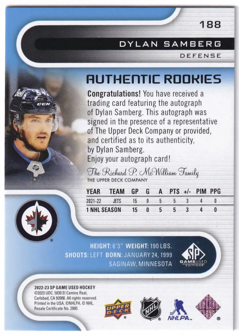 2022-23 SP Game Used Autographs Blue #188 Dylan Samberg Winnipeg Jets