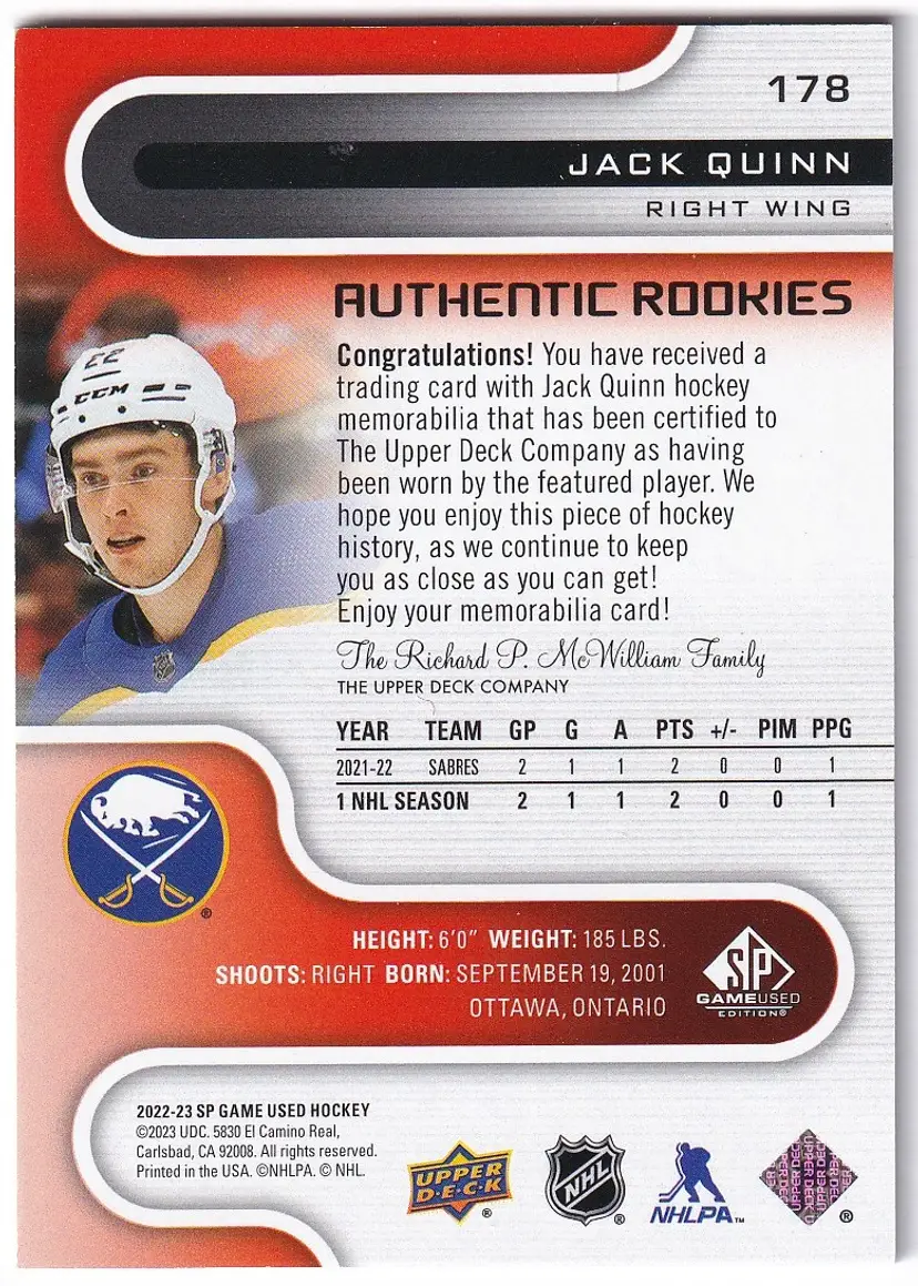 2022-23 SP Game Used Jerseys Red #178 Jack Quinn Buffalo Sabres