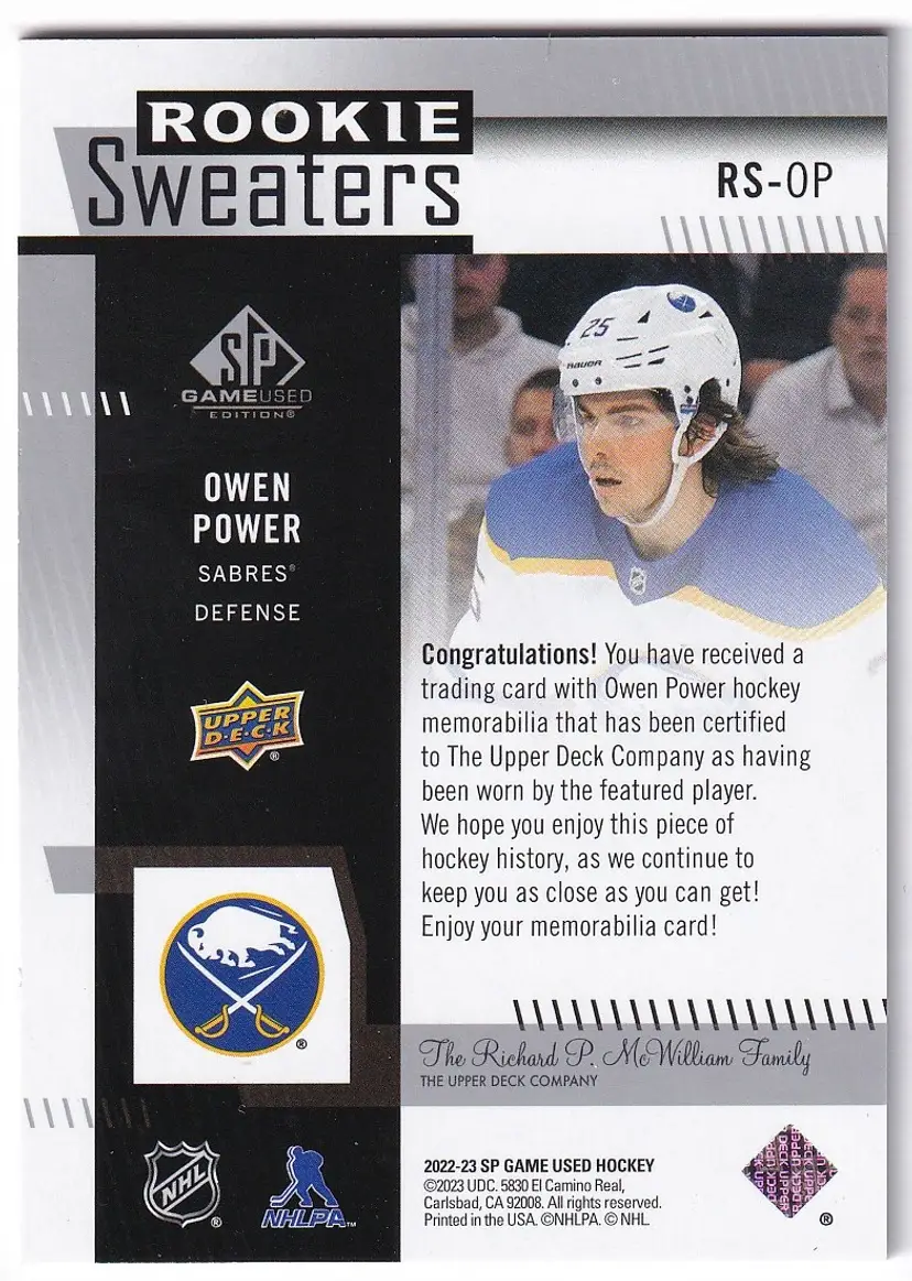 2022-23 SP Game Used Rookie Sweaters #RSOP Owen Power Buffalo Sabres