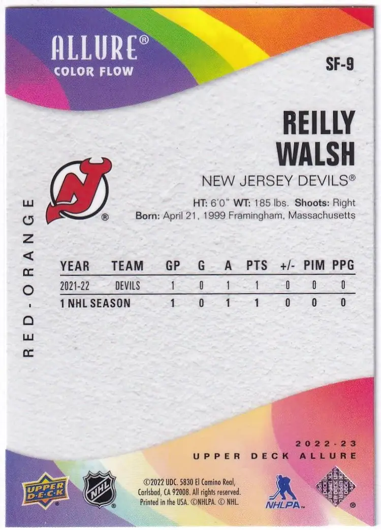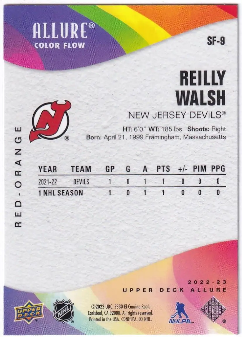 2022-23 Upper Deck Allure Color Flow Red Orange #SF9 Reilly Walsh New Jersey Devils