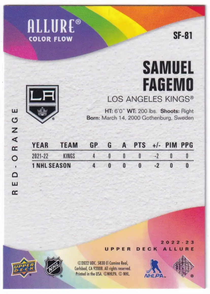 2022-23 Upper Deck Allure Color Flow Red Orange #SF81 Samuel Fagemo Los Angeles Kings