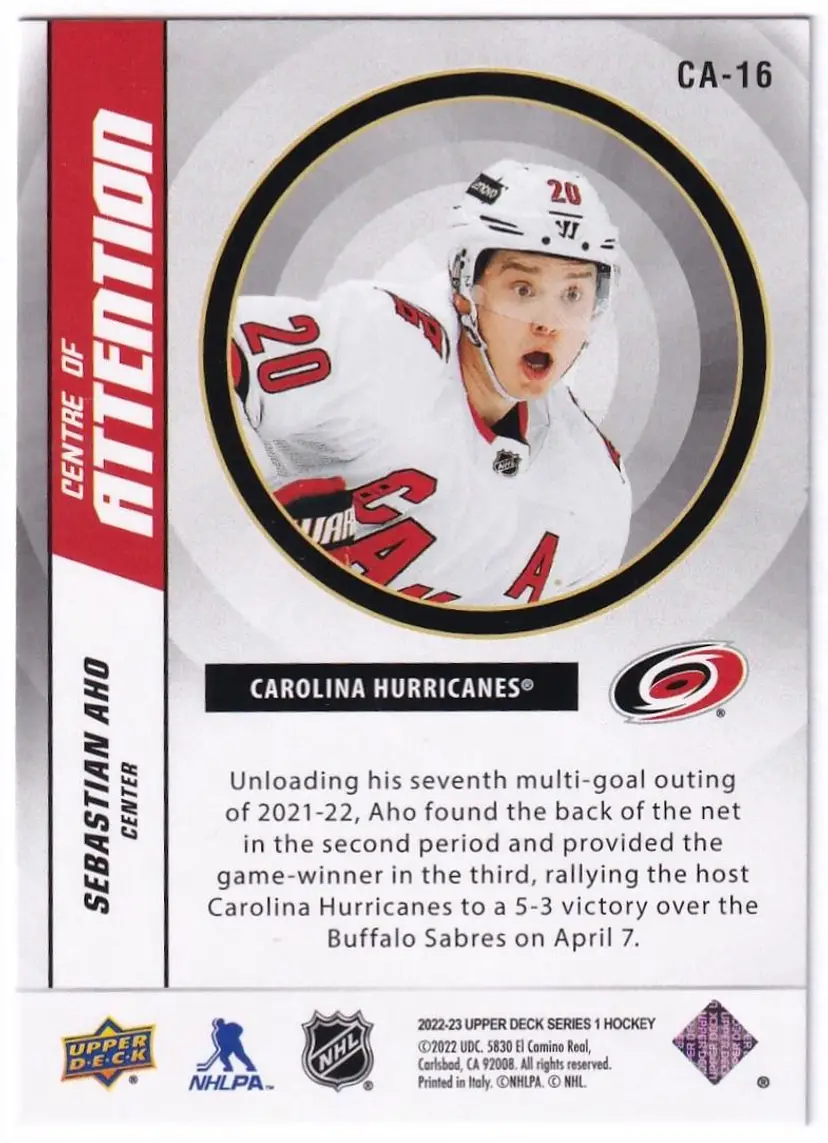 2022-23 Upper Deck Centre of Attention #CA16 Sebastian Aho Carolina Hurricanes