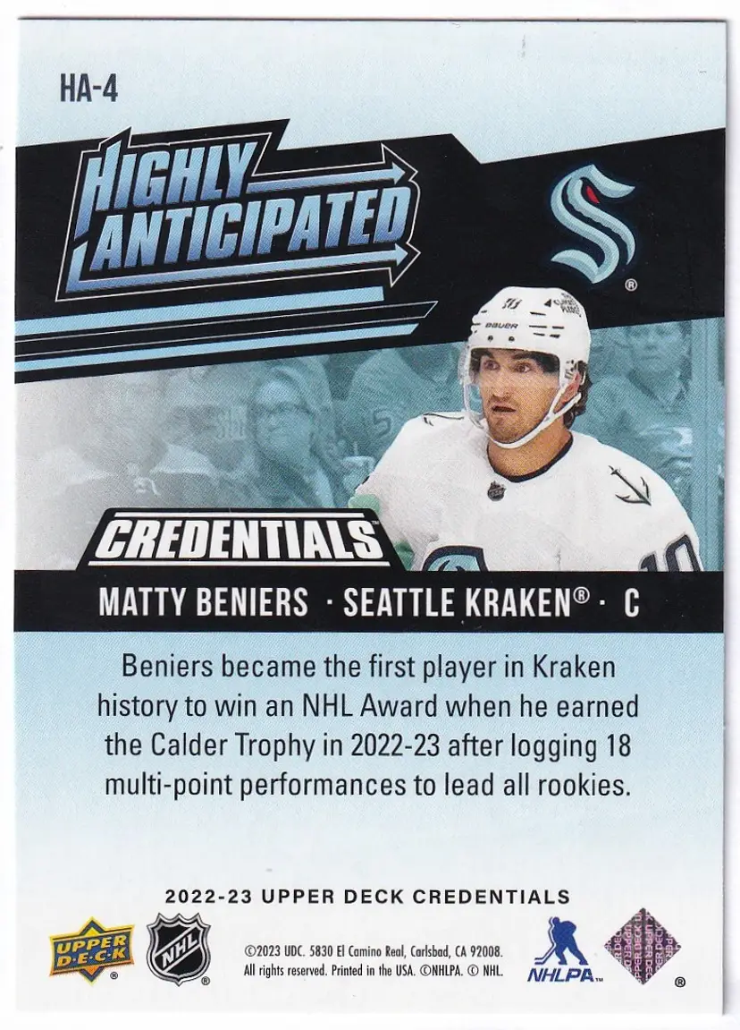2022-23 Upper Deck Credentials Highly Anticipated #HA4 Matty Beniers Seattle Kraken