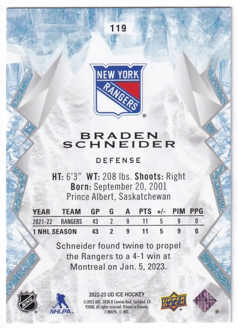 2022-23 Upper Deck Ice #119 Braden Schneider RC New York Rangers