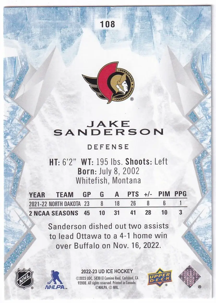 2022-23 Upper Deck Ice Green #108 Jake Sanderson Ottawa Senators