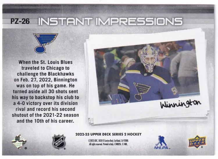 2022-23 Upper Deck Instant Impressions #PZ26 Jordan Binnington St. Louis Blues