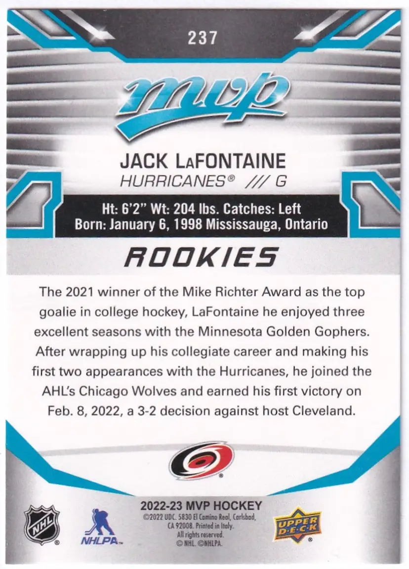 2022-23 Upper Deck MVP #237 Jack LaFontaine SP RC Carolina Hurricanes