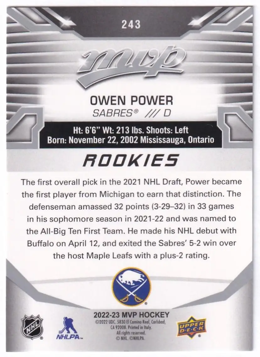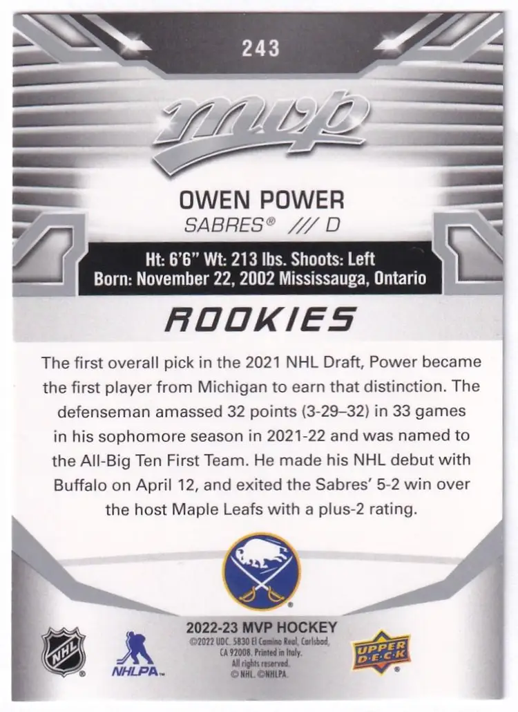 2022-23 Upper Deck MVP Silver Script #243 Owen Power SP Buffalo Sabres