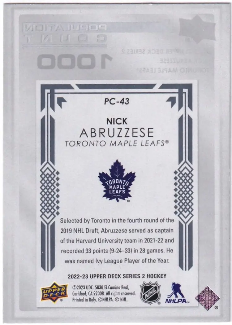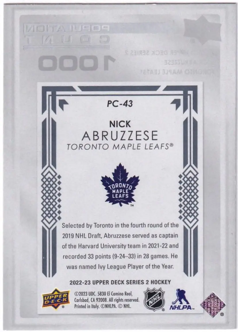 2022-23 Upper Deck Population Count 1000 #PC43 Nick Abruzzese Toronto Maple Leafs Print Run - 1000