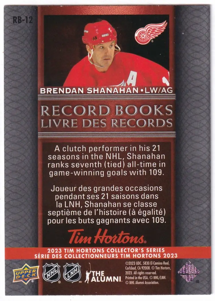 2022-23 Upper Deck Tim Hortons Legends Record Books #RB12 Brendan Shanahan Detroit Red Wings