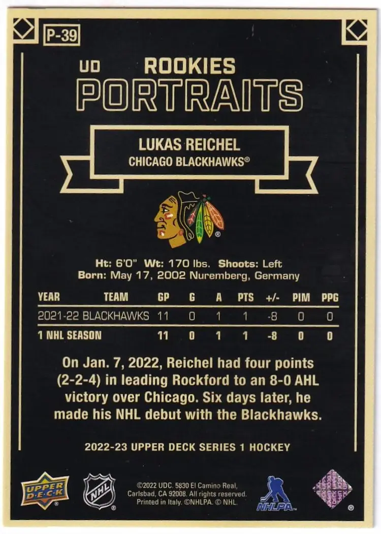 2022-23 Upper Deck UD Portraits #P39 Lukas Reichel SP Chicago Blackhawks
