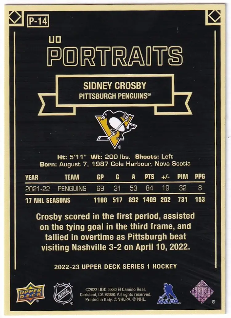 2022-23 Upper Deck UD Portraits #P14 Sidney Crosby Pittsburgh Penguins