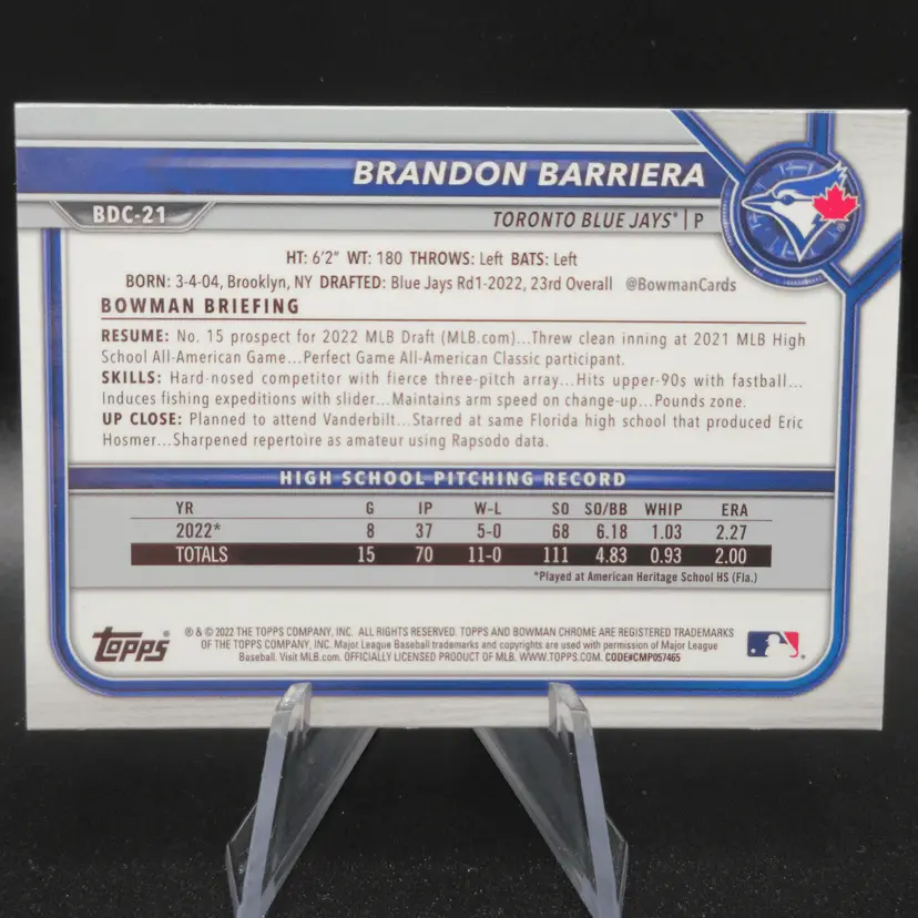 2022 Bowman Draft Chrome Sapphire Edition #BDC-21 Brandon Barriera 1st Bowman Toronto Blue Jays. Ships free PWE.