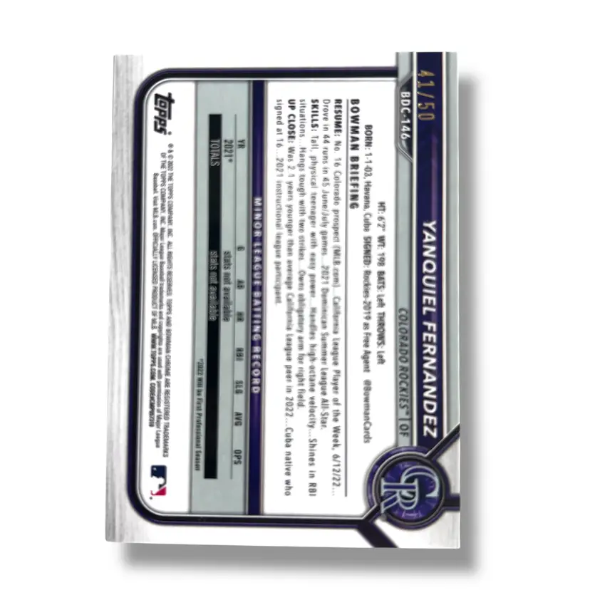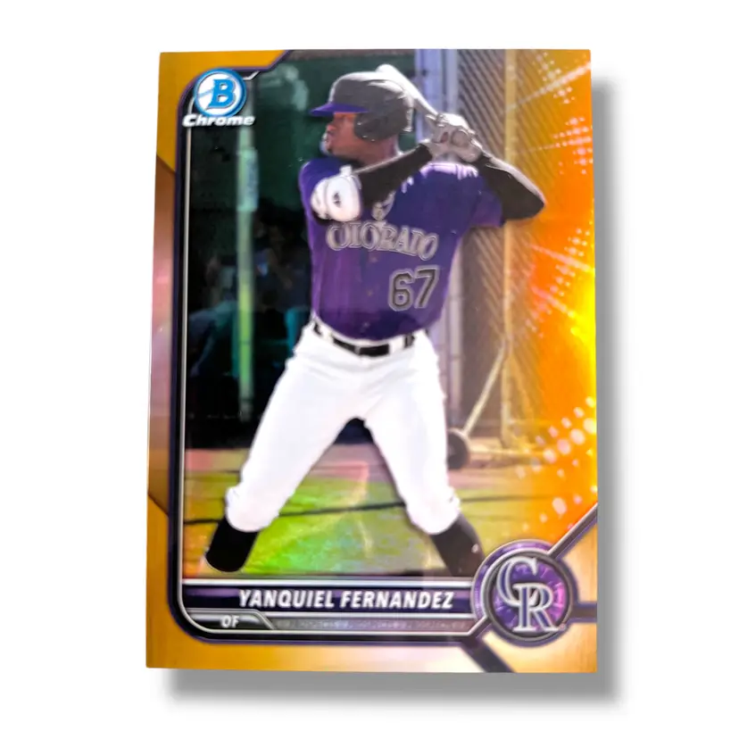 Here We Have a 2022 Bowman Draft Chrome Yanquiel Fernandez Gold Refractor 41/50 #BDC-146