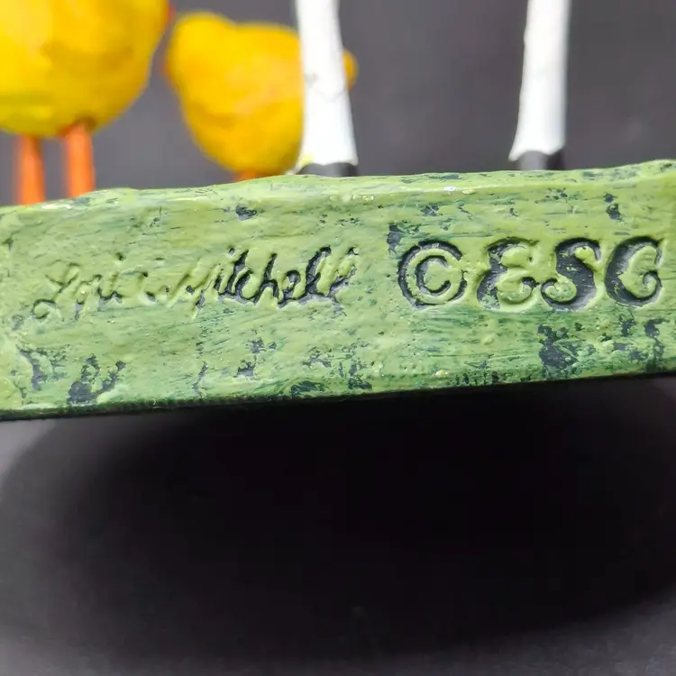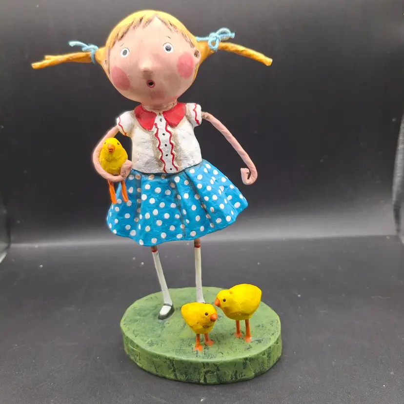 In a whimsical world where imagination knows no bounds, a young girl stands with her chicks by her side. She's dressed in a charming blue polka dot skirt, evoking the innocence of childhood. Each chick captures a moment of wonder and curiosity. Crafted with care, this figurine tells a story of friendship and the simple joys of life.