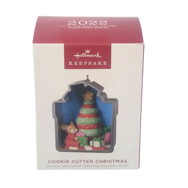 This 2022 Hallmark Cookie Cutter 11 Keepsake Ornament IOB QXR9073 is a must-have for any holiday decor enthusiast. Beautifully crafted, it adds a festive touch to any tree. This gift-shaped cookie cutter ornament features a cute interior scene of a cheery little mouse placing presents under the tree. Candy-themed decorations add even more charm to the sweet scene. •11th in the Cookie Cutter series. •Artist Nina Aubé. •Size Approx. 2.2 x 2.8 x 1.6 New in Original Box