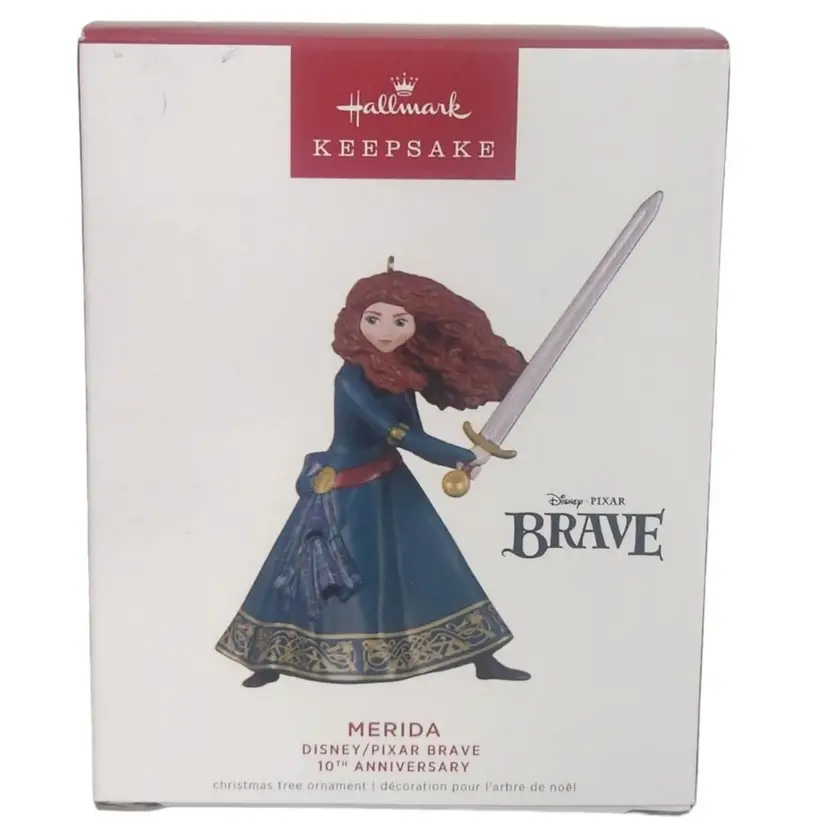 Celebrate the 10th anniversary of the Disney/Pixar classic "Brave" with this ornament of the rough-and-tumble Princess Merida. Fans of all ages will love this decoration that features the determined heroine from the Scottish Highlands with her fiery red hair, wielding a sword as she stands to protect her family and follow her dreams.