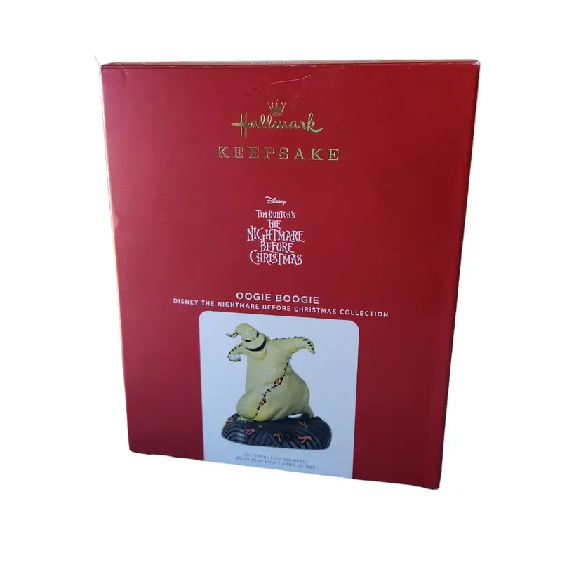 Relive the story of Halloween Town—and its residents' merry mission to make Christmas their own way—with this Christmas tree ornament featuring the villainous Oogie Boogie. Plug it into Hallmark's Keepsake Power Cord (sold separately) for constant illumination, then press the button to start an epic sound and light show from "The Nightmare Before Christmas." Connect all of the coordinating Storytellers ornaments—Jack Skellington, Sally, Santa Claus, Oogie Boogie and Lock, Shock, and Barrel (each sold separately)—to unlock additional amazingly interactive performances. Size Approx 4.6" W x 5" H x 3.6" D. New in original box, box has minor wear.