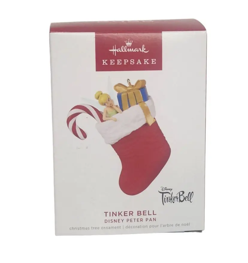 Nestled inside a festive red and white stocking, Tinker Bell is ready to spread some cheer. This adorable pixie ornament features the beloved Disney fairy with translucent wings, settled between a candy cane and a wrapped present. Tink fans will be thinking happy thoughts as they hang this ornament with care on their Christmas tree.