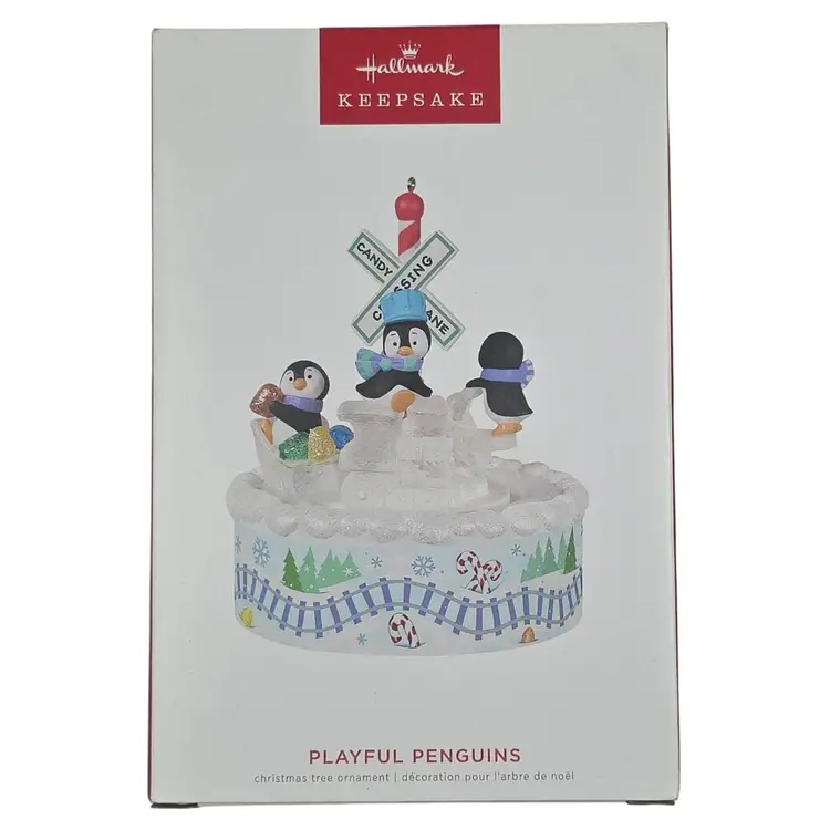 All aboard for holiday fun! Riding around on an icy train—and hand car—this trio of playful penguins is full of wintry fun. This Christmas tree ornament lights up and the penguin pals move to the music of "Here We Come A-Wassailing". • Artist Kristina Gaughran. • Size Approx. 3.56 x 4.5 x 3.56 • Requires three (3) AAA replaceable batteries (not included). New in the original box. Original box has minor wear due to storage.