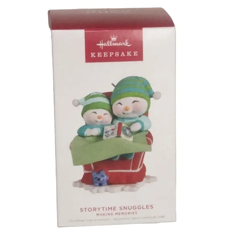 2022 Hallmark Storytime Snuggles Keepsake Ornament is a perfect addition to your holiday decor. This 15 ornament set is in its original box (IOB), colorful, and ready to create lasting memories. Have a cozy little Christmas with this glittery Christmas tree ornament. A big snowman and little snowman snuggle under a fabric blanket as they read a story about a puppy. Share warm memories of your own special story times spent in matching family jammies with this sweet decoration. • 15th in the Making Memories Keepsake Ornament series. • Size Approx. 2.04 x 2.77 x 2.06 • Artist Tammy Haddix. New in Original Box.