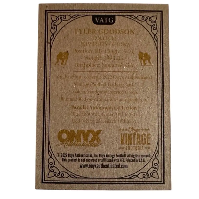 The 2022 Onyx Vintage Tyler Goodson #VATG Blue Signatures trading card is a highly sought-after collectible for football fans and card enthusiasts. This particular card features a blue signature parallel variety, making it unique and special. Manufactured by Onyx Authenticated, this rookie card from the Iowa Hawkeyes is part of the 2022 Onyx Vintage set, adding to its value and desirability among collectors. With its exclusive features and limited availability, this card is a must-have for fans of Tyler Goodson and the Iowa Hawkeyes.