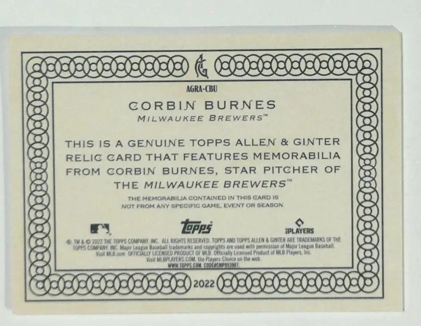 2022 Topps ARGA-CBU Allen & Ginter Corbin Burnes Milwaukee Brewers Game Used 2 Color Relic Baseball