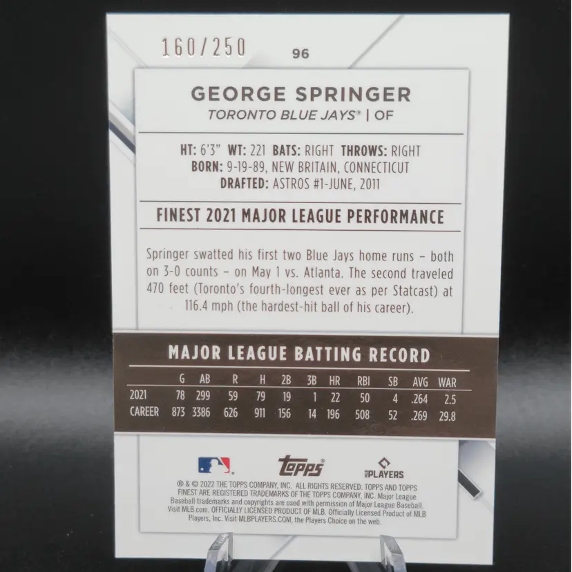 2022 Topps Finest #96 George Springer Blue/Aqua Vapor Refractor /250 Toronto Blue Jays. Ships free PWE.