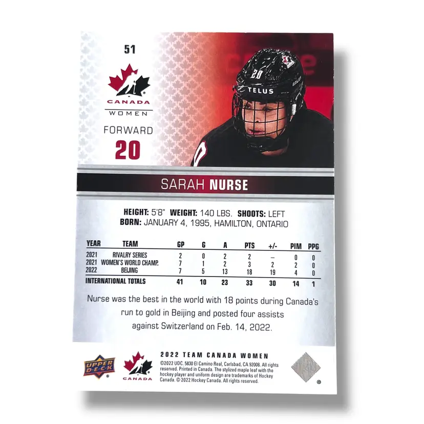 Here We Have a 2022 Upper Deck Sarah Nurse 11/100 Team Canada Juniors - Exclusives #51