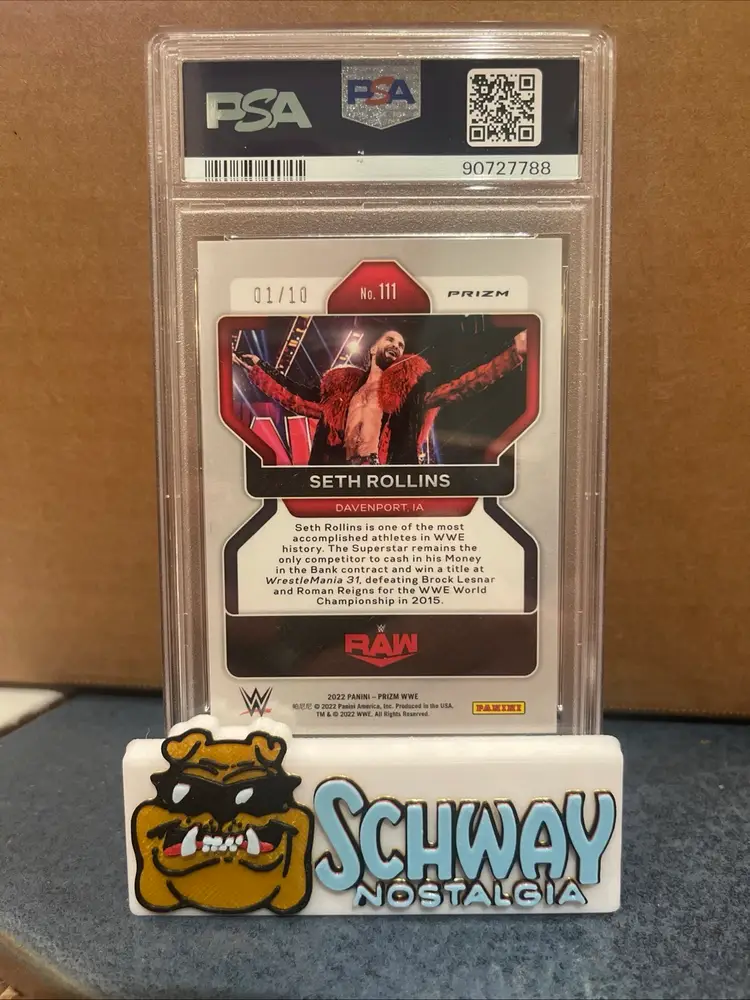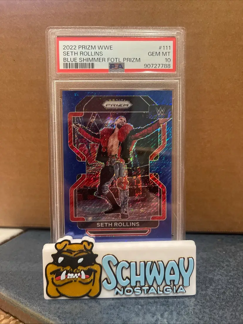 This 2022 WWE Prizm card features Seth Rollins in a stunning Blue Shimmer Prizm parallel variety. The card is serial numbered and rare, with only 10 in existence. It has been professionally graded by PSA and received a perfect score of 10. This card is part of the 2023 Panini Prizm WWE set and is a must-have for any wrestling fan or collector.