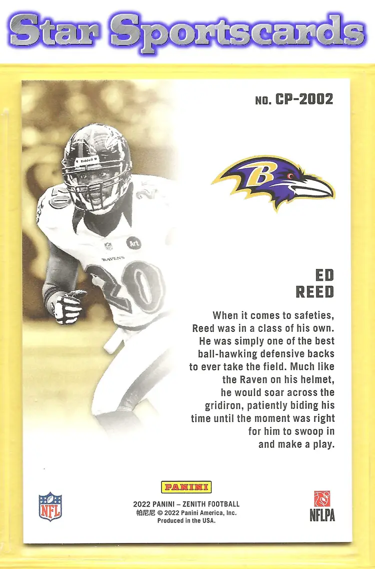This is a nice example of a 2022 Zenith #CP-2002 Ed Reed Class President .Other important information about this card: In Ed Reed played for the Baltimore Ravens.Please check out our other listings for more great cards.