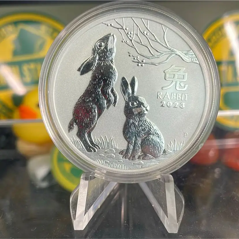 The reverse side of 2023 1 oz Silver Lunar Rabbit Coins comes with a depiction of two rabbits. In this design, one rabbit is seated beneath a branch and alert to all possible dangers. The other rabbit is carefree as it stands on its hind legs and sniffs at the overhanging branch above.