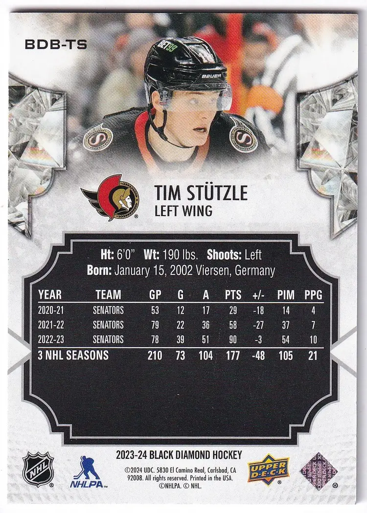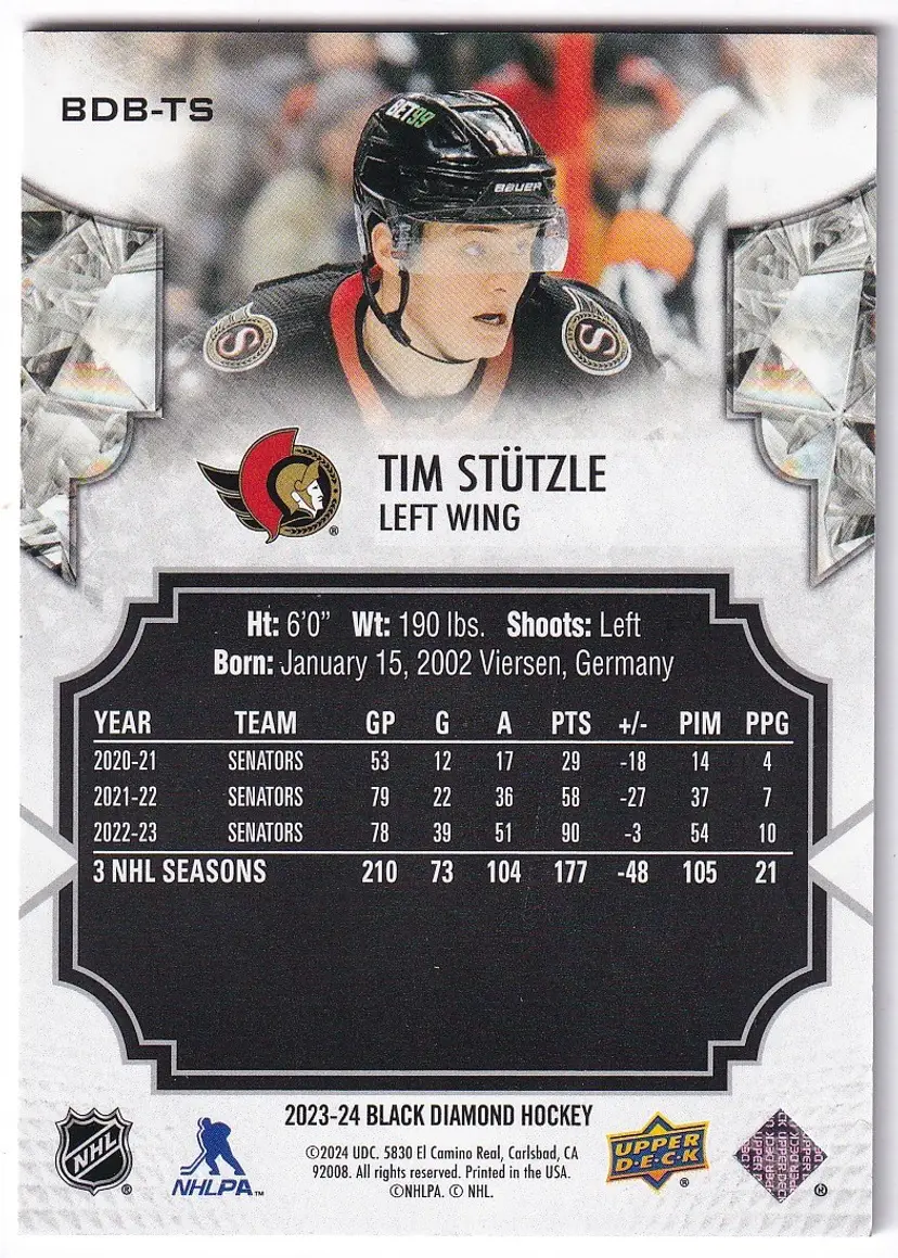2023-24 Black Diamond #BDBTS Tim Stutzle Ottawa Senators Print Run - 349