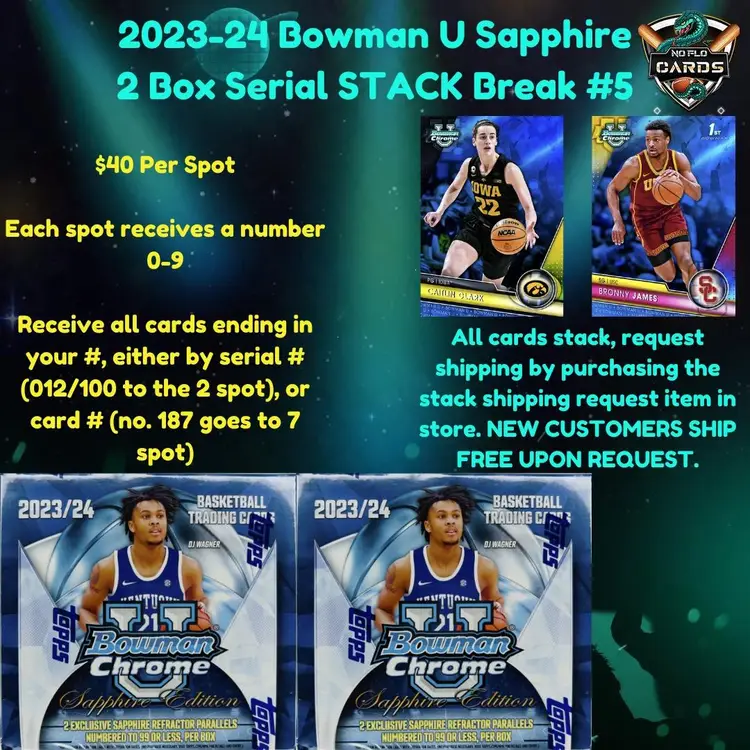 Get in the game for $40 a spot and land cards with serial numbers ending in 0-9. Your chance to score big with either the serial # or the card #! All cards stack, so secure your collection by purchasing the stack shipping request item in store. NEW CUSTOMERS SHIP FREE UPON REQUEST.