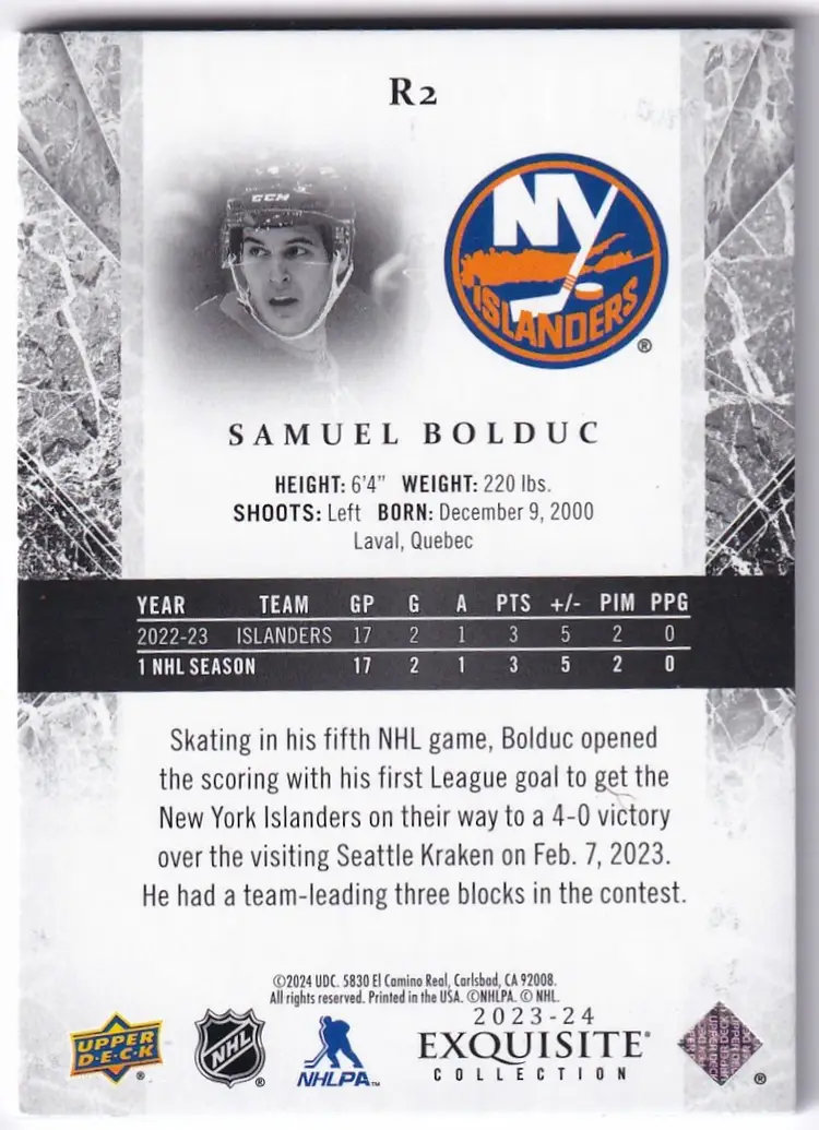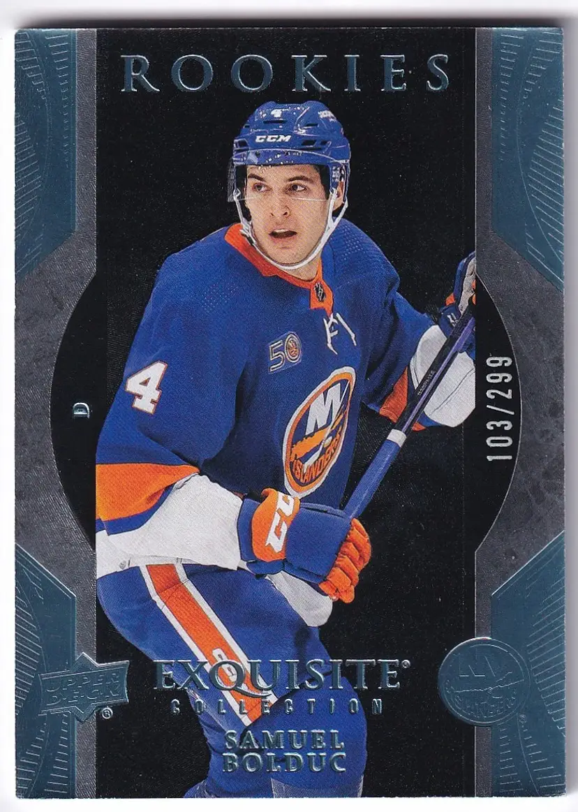 2023-24 Exquisite Collection Rookies Platinum Blue #R2 Samuel Bolduc New York Islanders Print Run - 299
