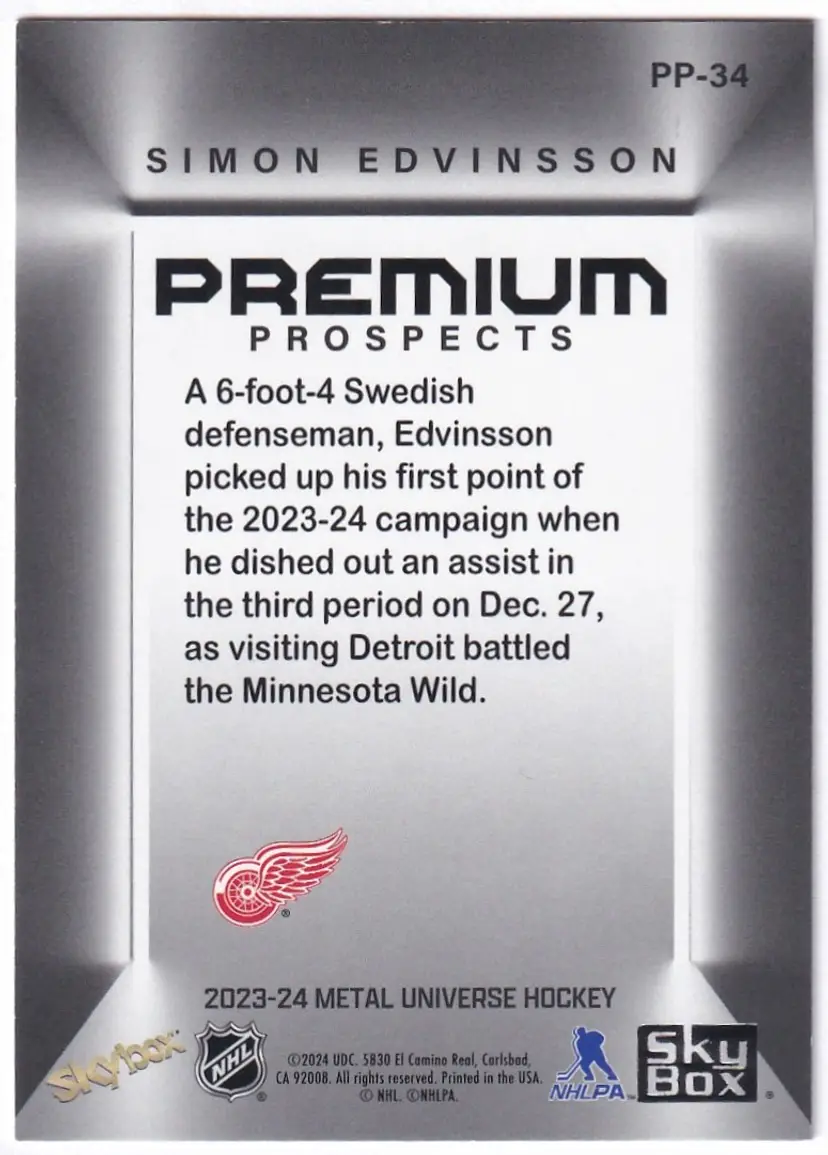2023-24 Metal Universe SkyBox Premium Prospects #PP34 Simon Edvinsson Detroit Red Wings