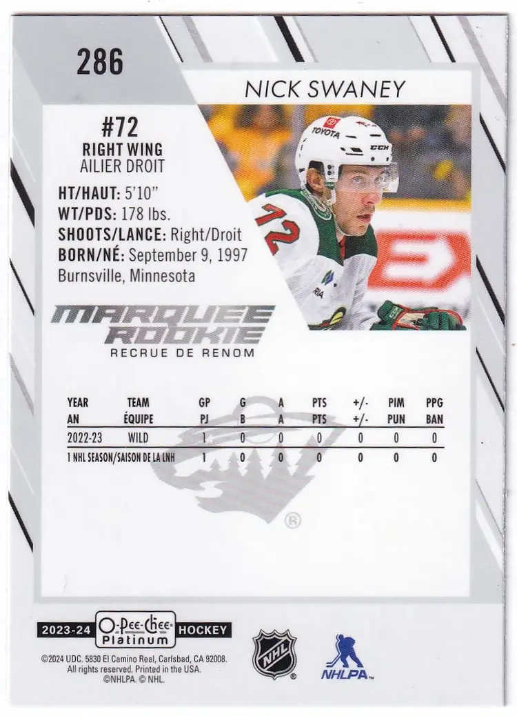 2023-24 O-Pee-Chee Platinum #286 Nick Swaney RC Minnesota Wild