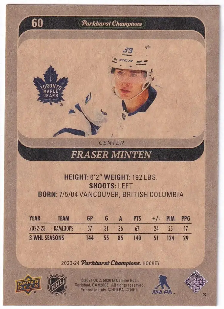2023-24 Parkhurst Champions #60 Fraser Minten RC Toronto Maple Leafs