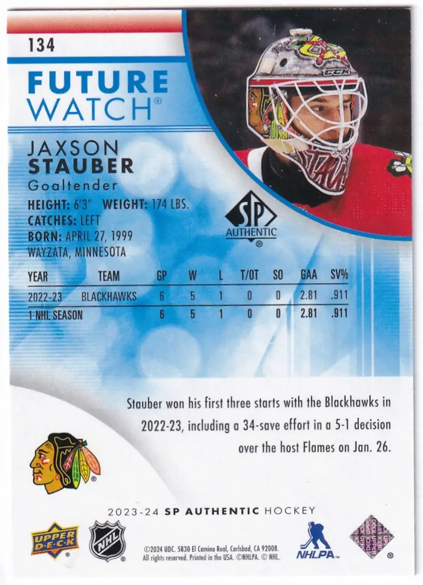 2023-24 SP Authentic Limited Blue #134 Jaxson Stauber FW Chicago Blackhawks Print Run - 399