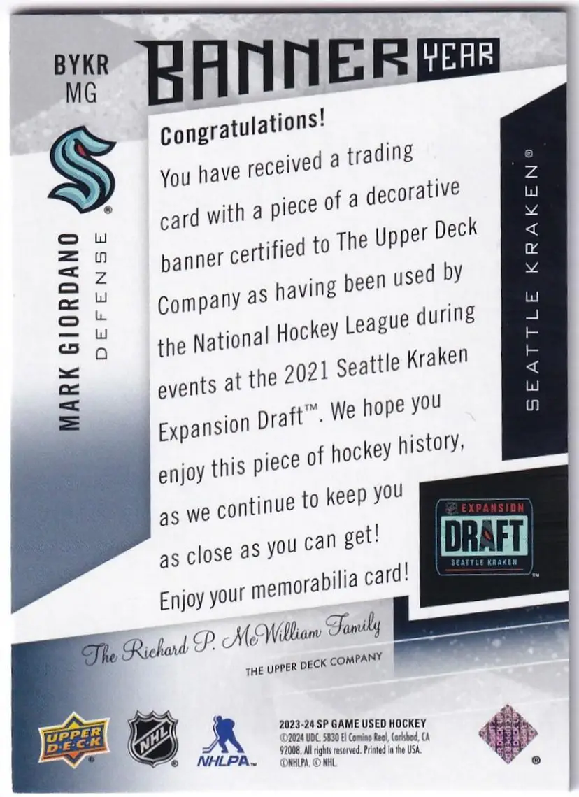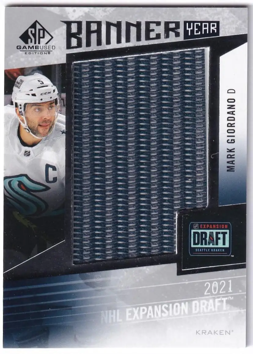 2023-24 SP Game Used Banner Year '21 Seattle Kraken Expansion Draft #BYKRMG Mark Giordano Seattle Kraken