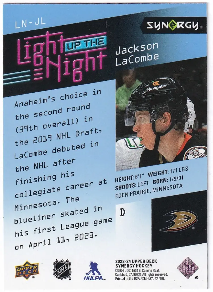 2023-24 Synergy Light Up the Night Rookies Blue #LNJL Jackson LaCombe Anaheim Ducks Print Run - 499