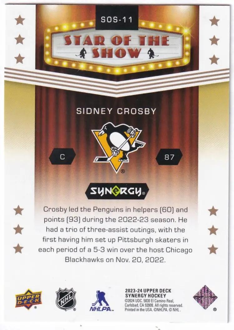 2023-24 Synergy Star Of The Show #SOS11 Sidney Crosby Pittsburgh Penguins