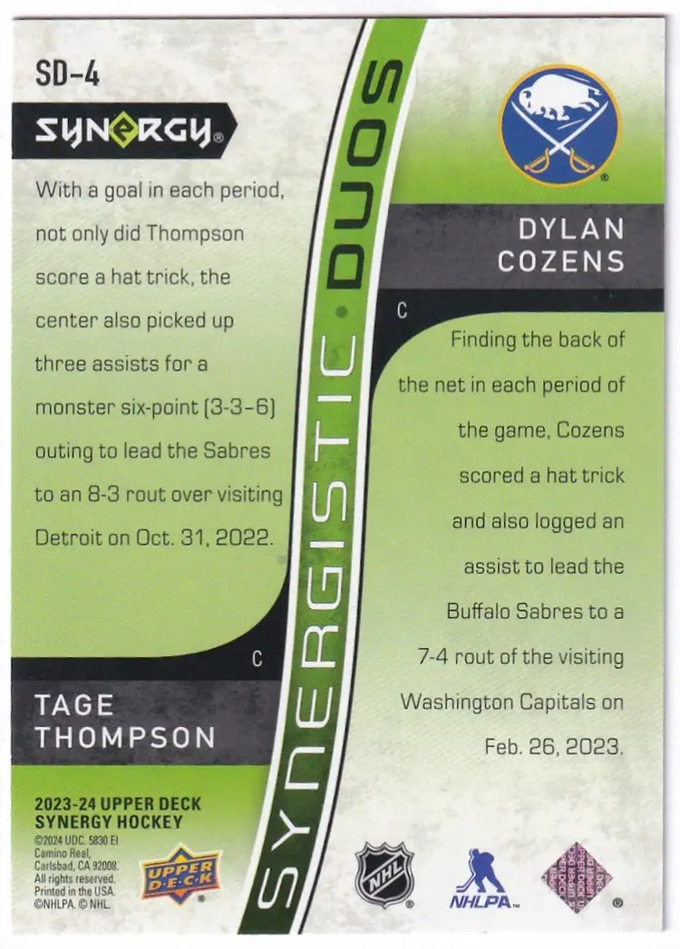 2023-24 Synergy Synergistic Duos Star Star #SD4 Tage Thompson/Dylan Cozens Buffalo Sabres Print Run - 999