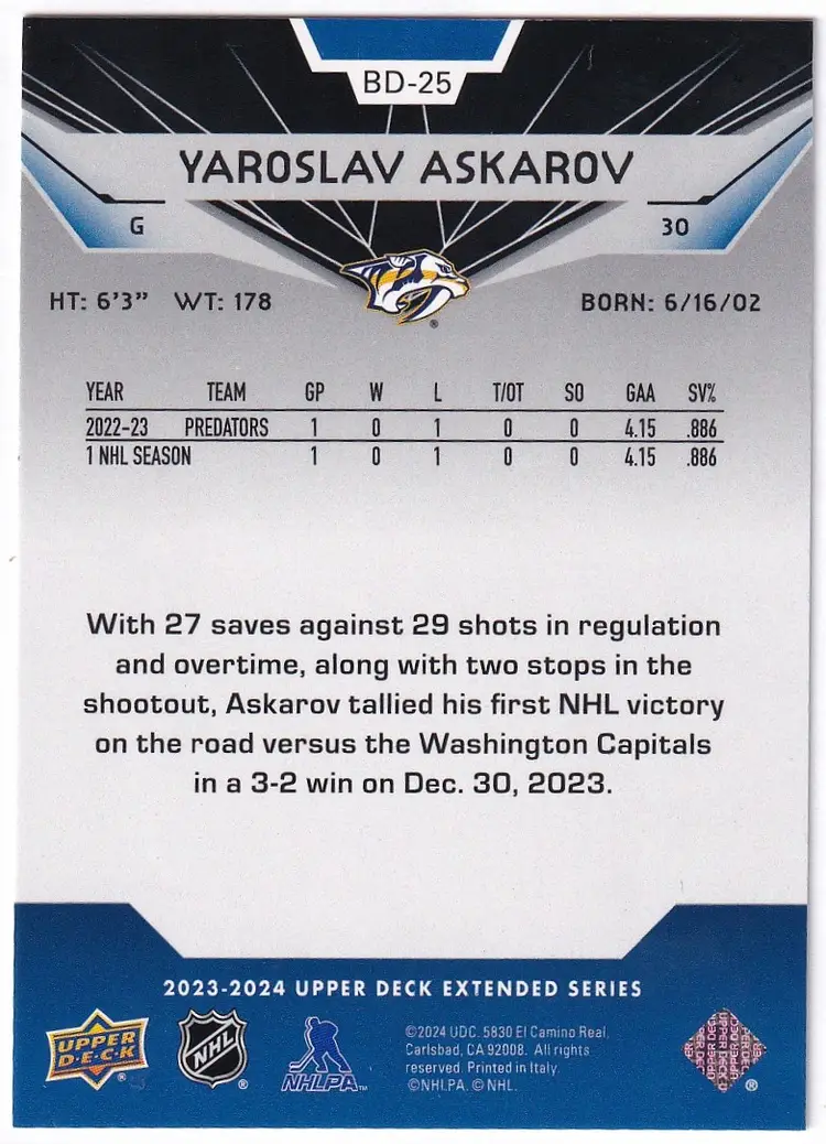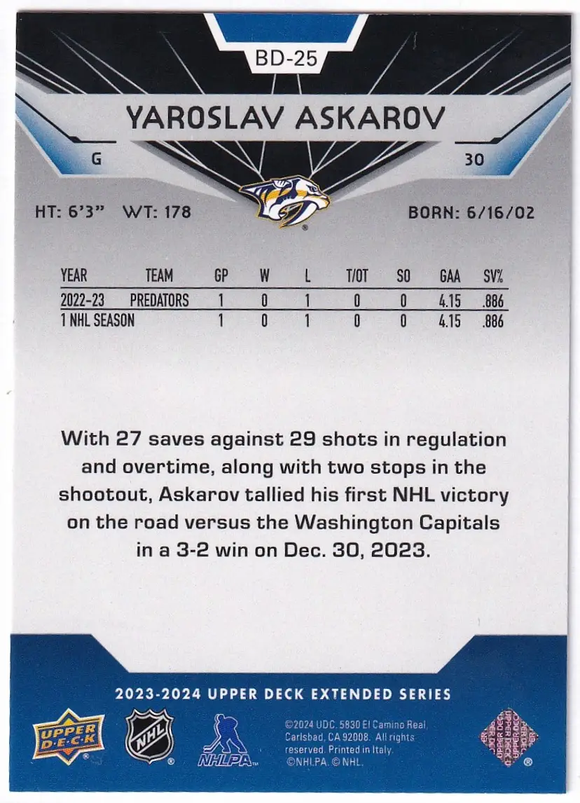 2023-24 Upper Deck '07-08 Black Diamond Retros #BD25 Yaroslav Askarov Nashville Predators