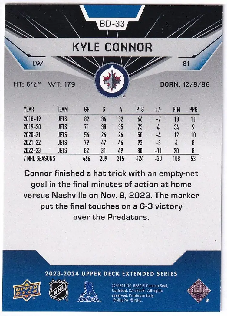 2023-24 Upper Deck '07-08 Black Diamond Retros #BD33 Kyle Connor Winnipeg Jets